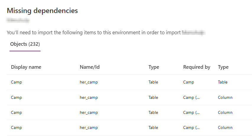 The error message: “The solution.xml for the solution xxx contains an unmanaged dependency on the Active solution with type 1, schemaName her_camp, displayName Camp. A solution will fail to import in a target environment when missing dependencies on unmanaged components are present.”